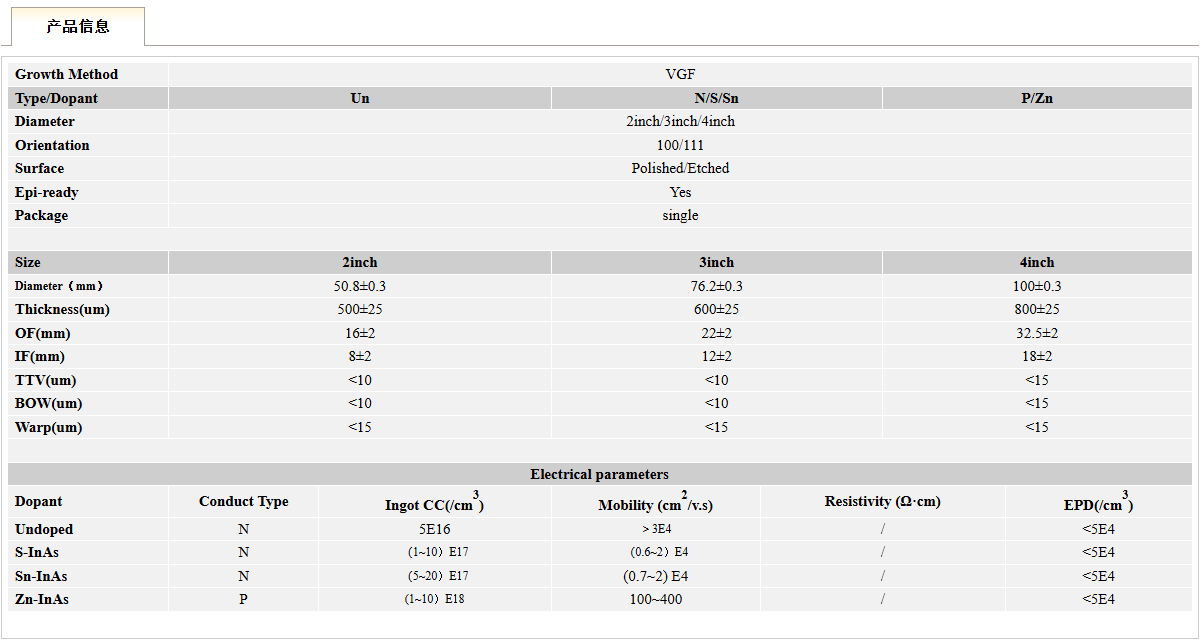 概述:InAs晶体具有较高的电子迁移率和迁移率比值(μe/μh=70),低的磁阻效应和小的电阻温度系数,是制造霍耳器件和磁阻器件的理想材料。
