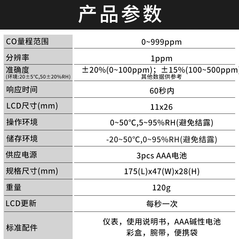 AZ7701计单气体检测仪用来检测环境空气中的CO,测量范围为0-1000ppm,可设置浓度超过设定值时进行声光报警,并可按具体规定值调整报警值。
