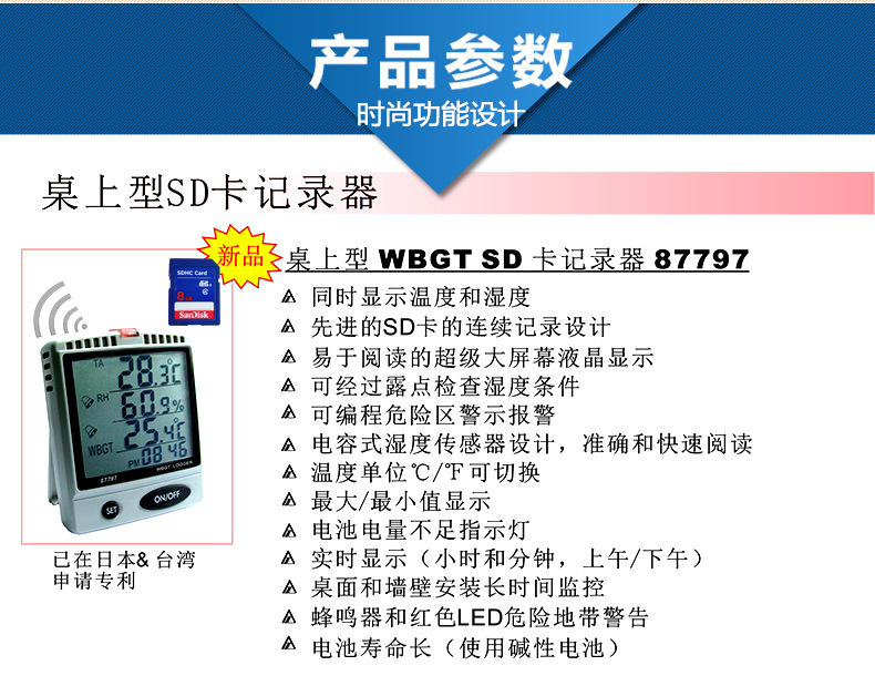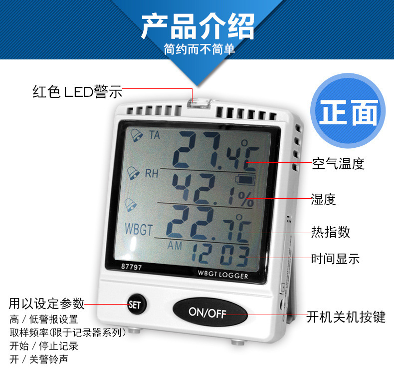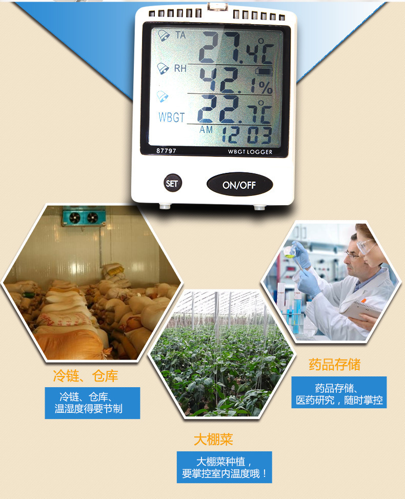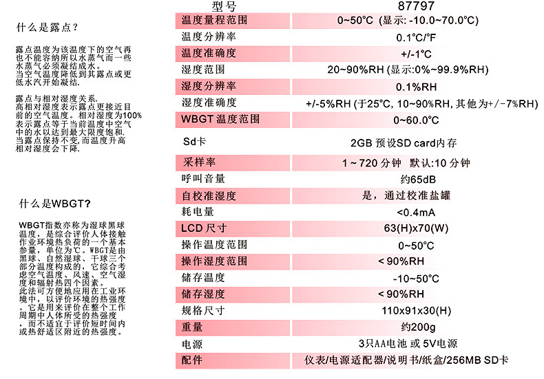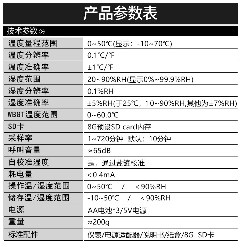 | 型号 | SD卡 | 温度 | 湿度 | WBGT | 露点 | 外接温度探头 |