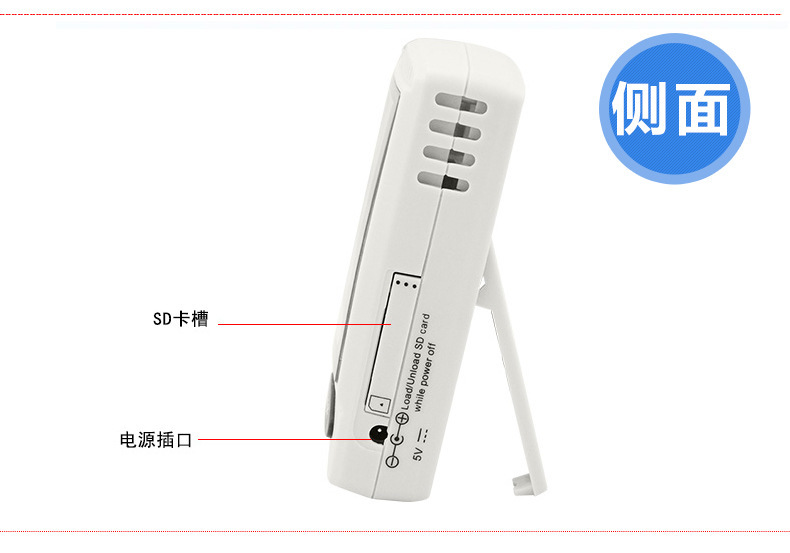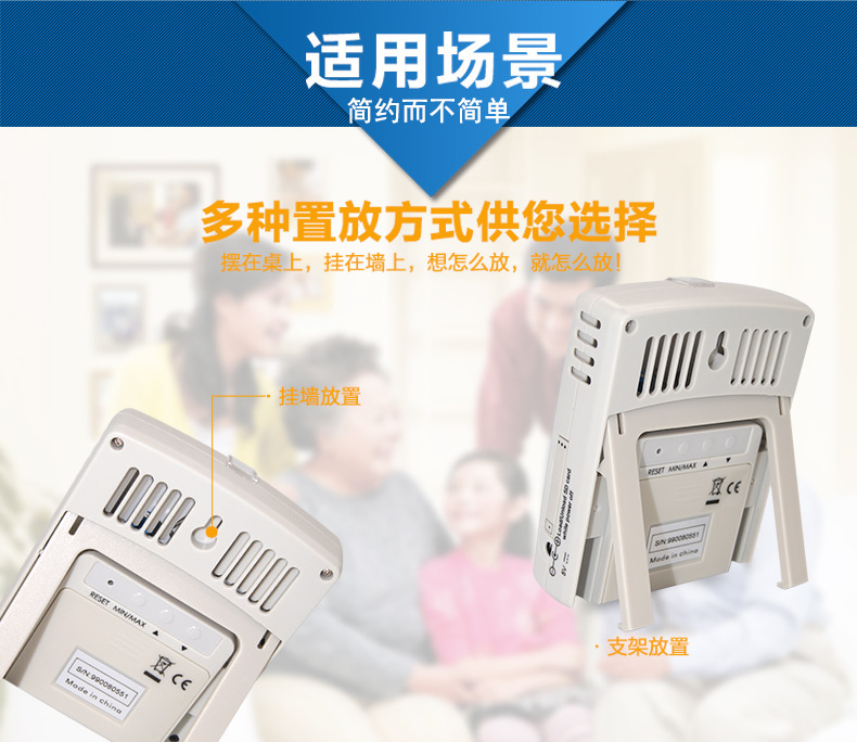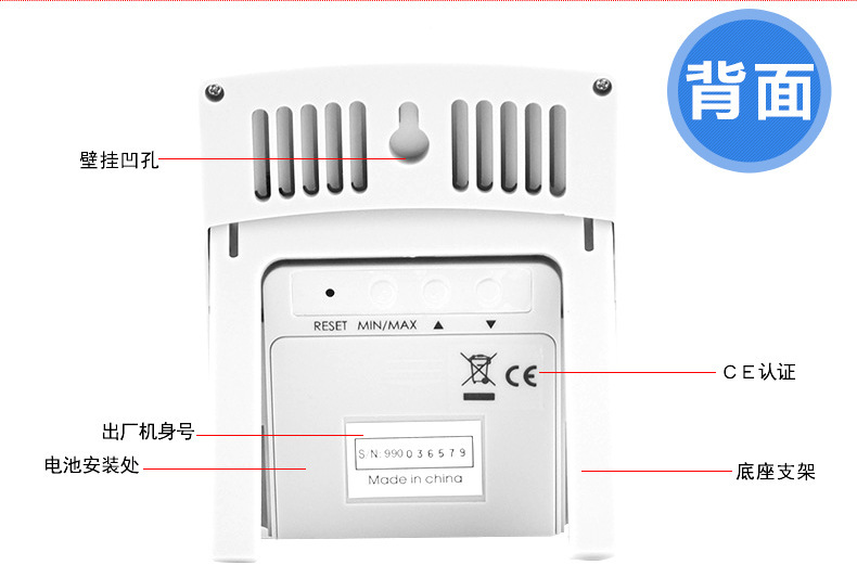 同时显示温度和湿度 易读的超级大液晶显示器 计算露点 带报警 电容式传感器 /最小值 电池低指标 实时显示(小时和分钟,AM / PM)桌面和壁上长时间监测 电池寿命长
