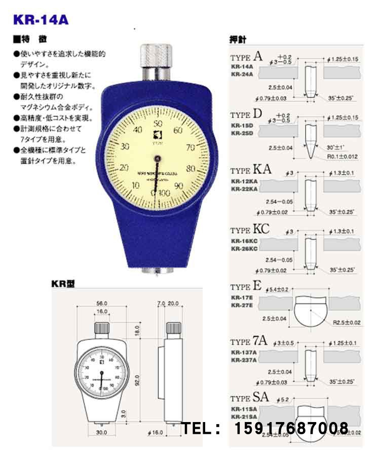 | KR-14A | A型 | 一般橡胶 | JIS K6253 ISO7619 ASTM 2240 | 550-8050mN(56.1-821.1gf) | 280g | 单针 |