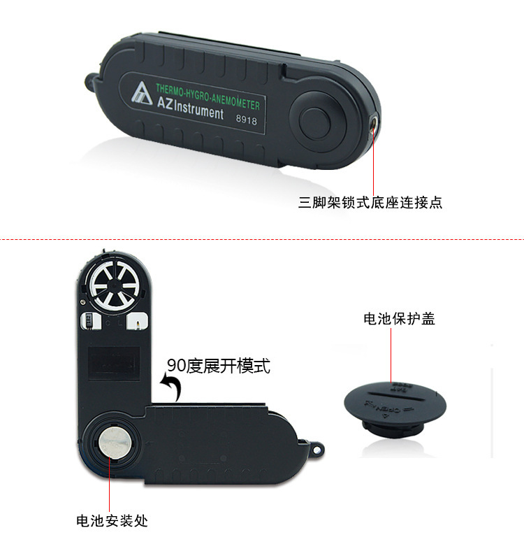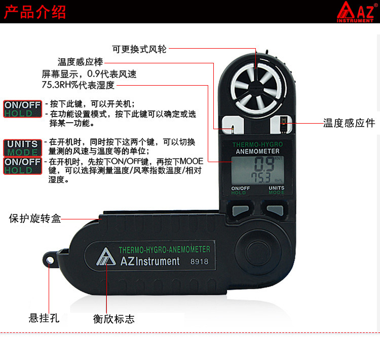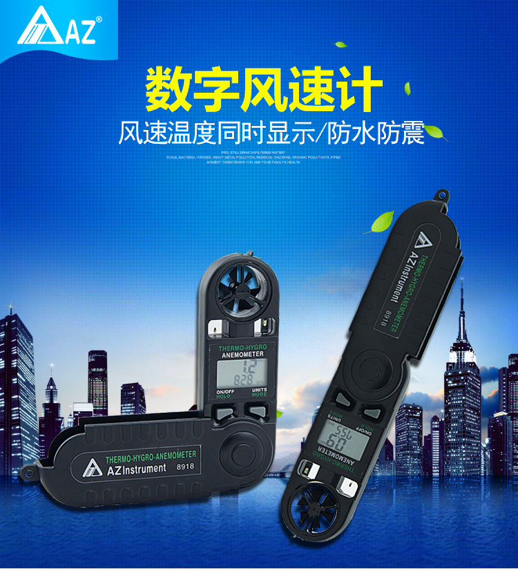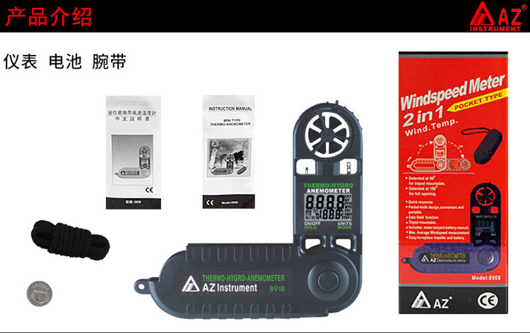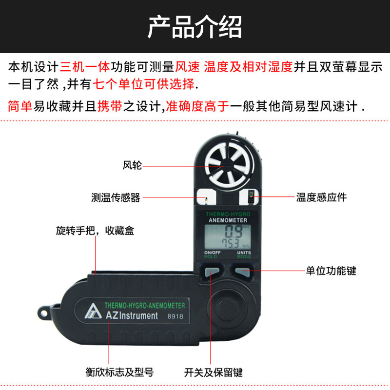 供应台湾衡欣AZ8918三合一风速计 迷你型风速仪,温度,湿度,风速测量