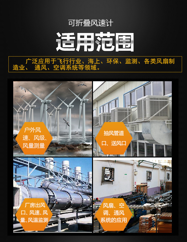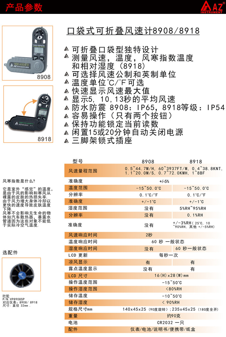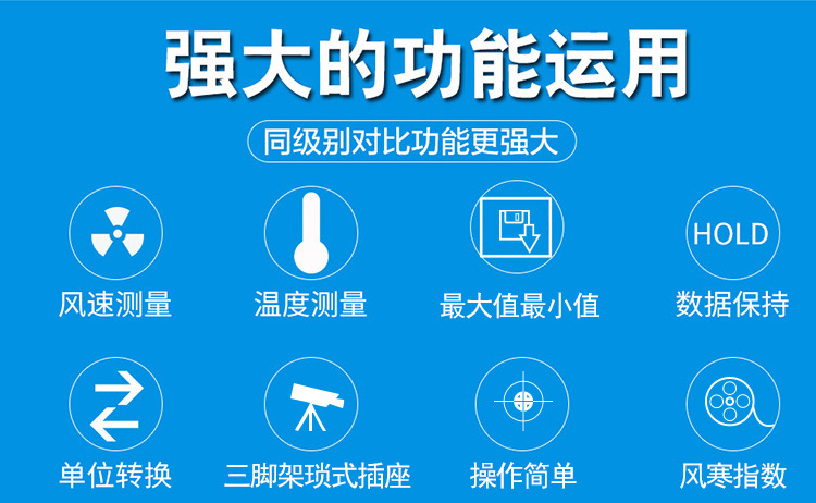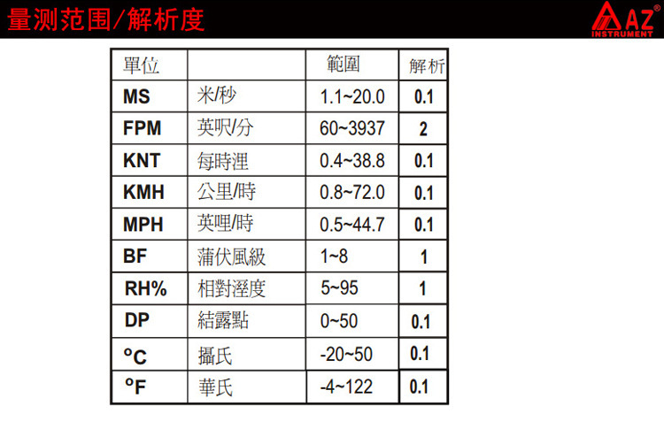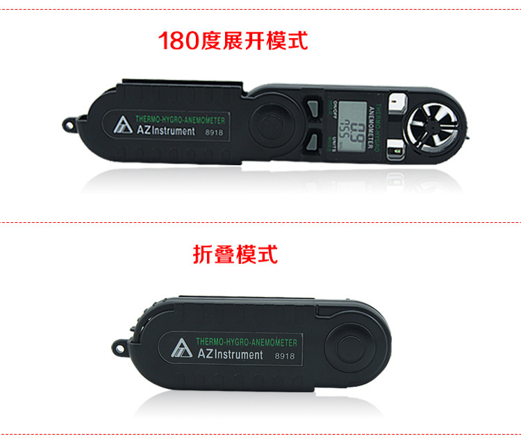 180 °折叠,同时显示风速风温;20分钟自动关机、低电压显示及风寒指数;多单位显示:米/秒; 公里/小时; 英尺/分钟; 海里(海里/小时);/最小/平均值锁定功能
