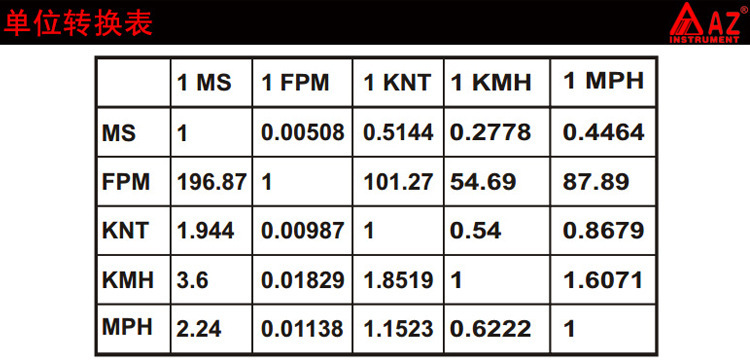 单位转换:风速m/s,ft/min,MPH,knots,Km/hr