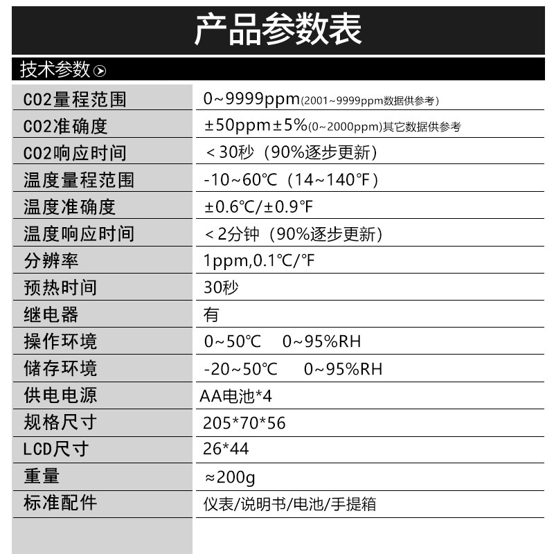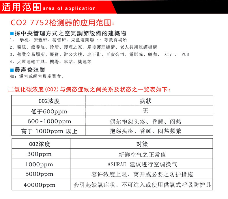 偵測範圍:0 - 2000ppm 2001~9999ppm( 準確度不保證)