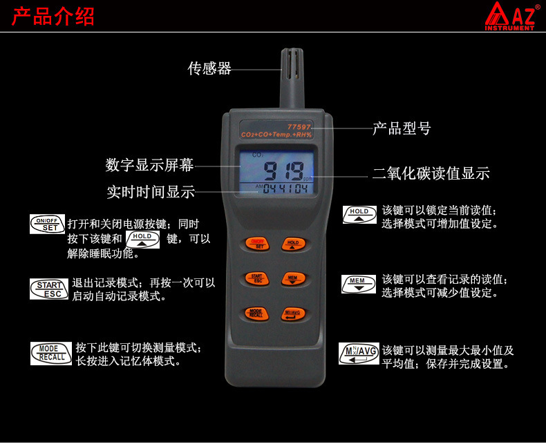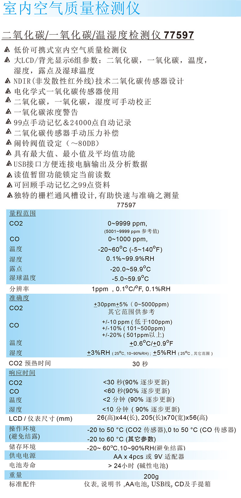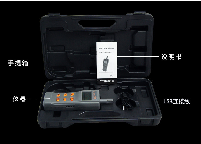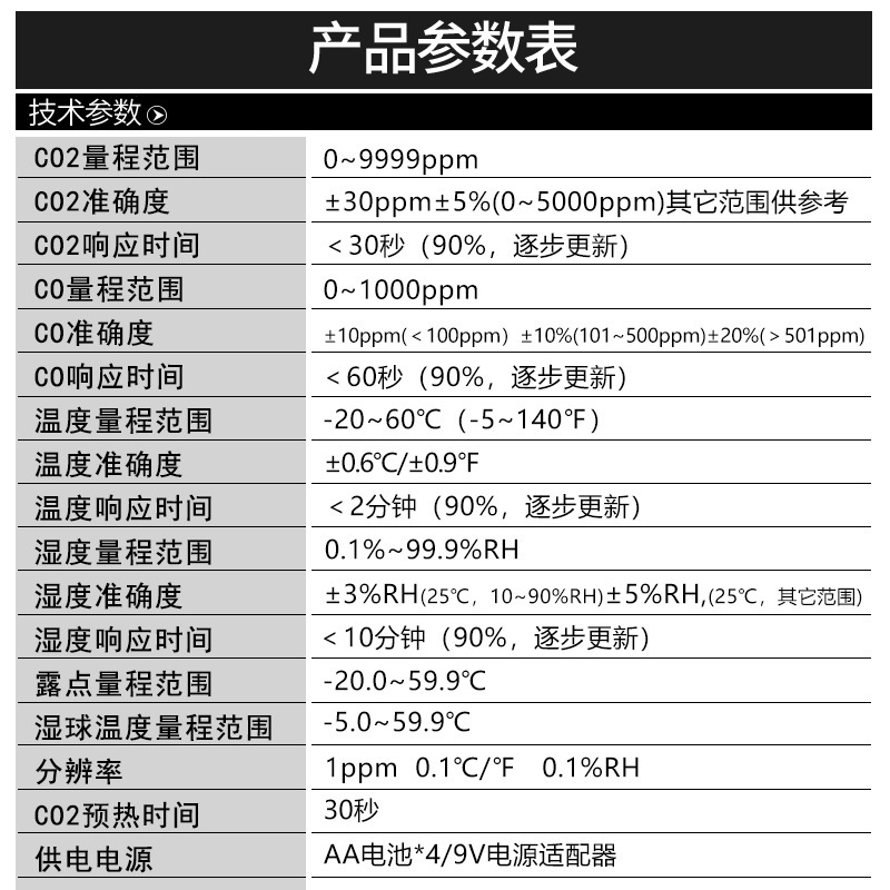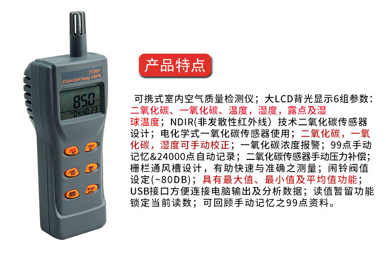 可检测二氧化碳、、温度、湿度、露点、湿球温度