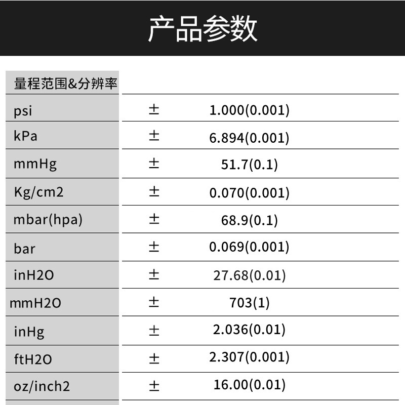 显示11项压力单位bar,mbar,psi,inHg,mmHg,ozin2,inH2O,ftH2O,cmH2O,kgcm2,kPa