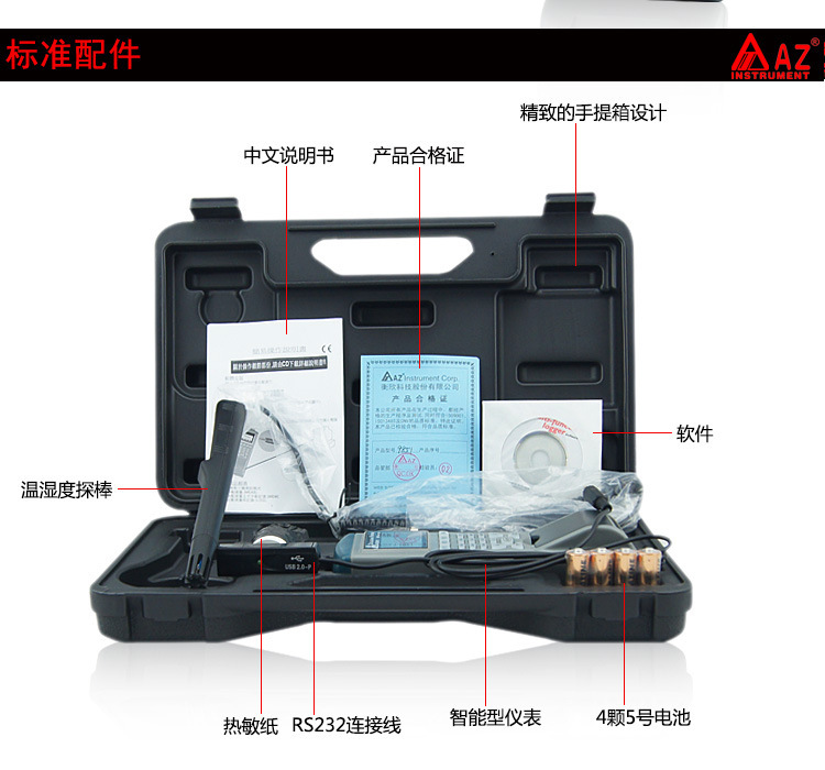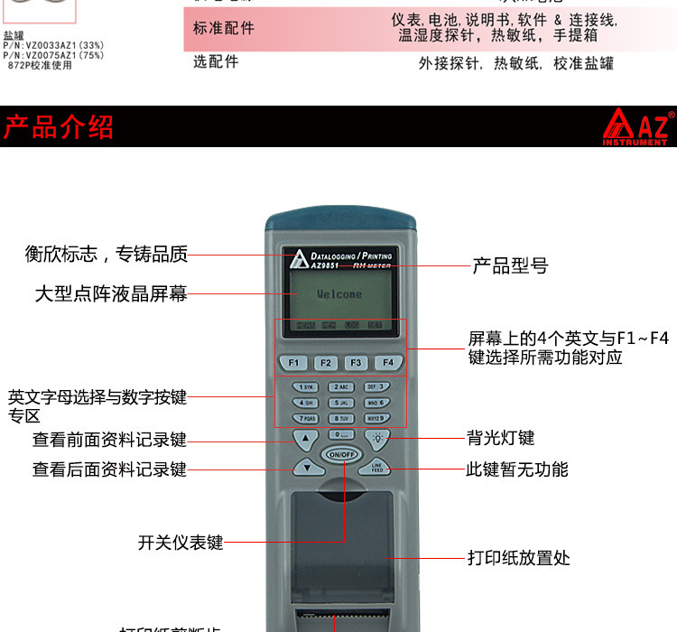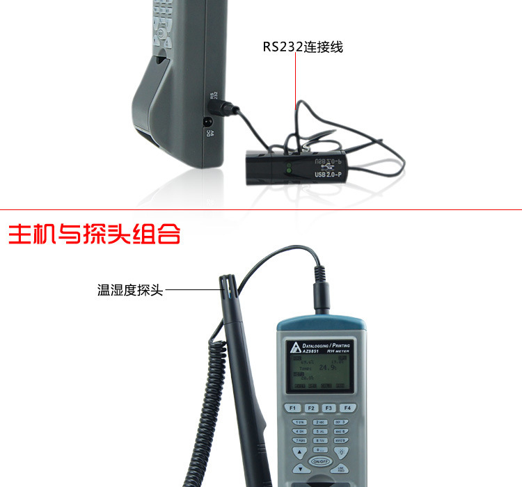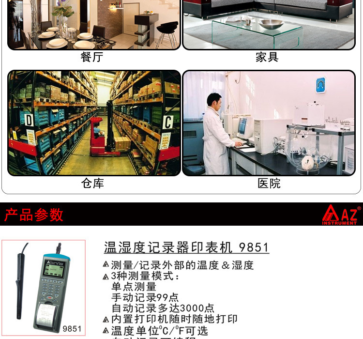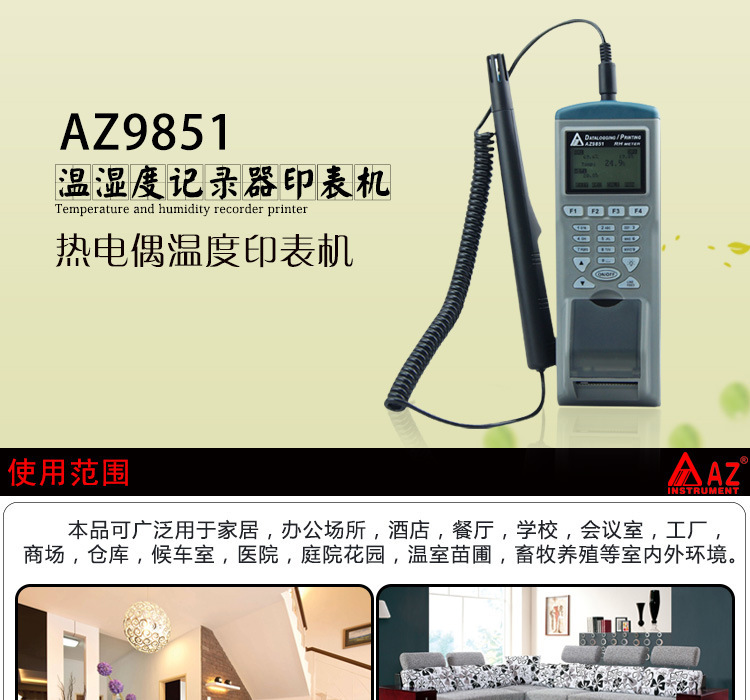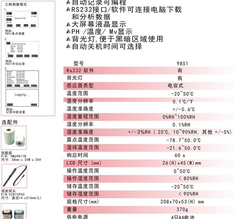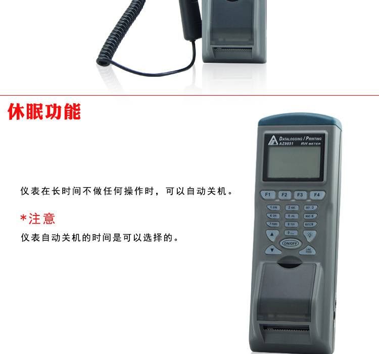 | 供应台湾衡欣AZ9851列表式温湿度计 带记录打印 湿度测量、记录、打印三合一 读数锁定,记录最小值 点阵LCD显示 带背光显示 记忆99笔资料,显示时间 测量项目:温度T1,湿度,露点,湿球温度 采用原装进口瑞士高级湿度探头 温度单位转换℃/℉。 自动关机装置。低电压显示。 RS232信号输出,可无线传输到电脑 单点测量,多次测量记忆,连续记录功能 记录测量3000个数据,记忆99组