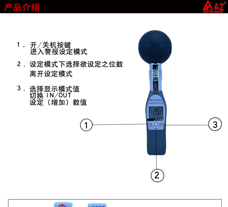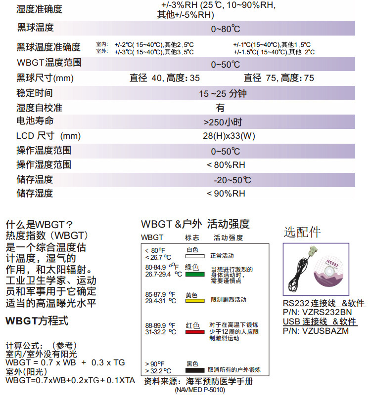 · 四个参数:WBGT (湿球温度 ), TG(黑球温度),TA(空气温度)和%(相对湿度).