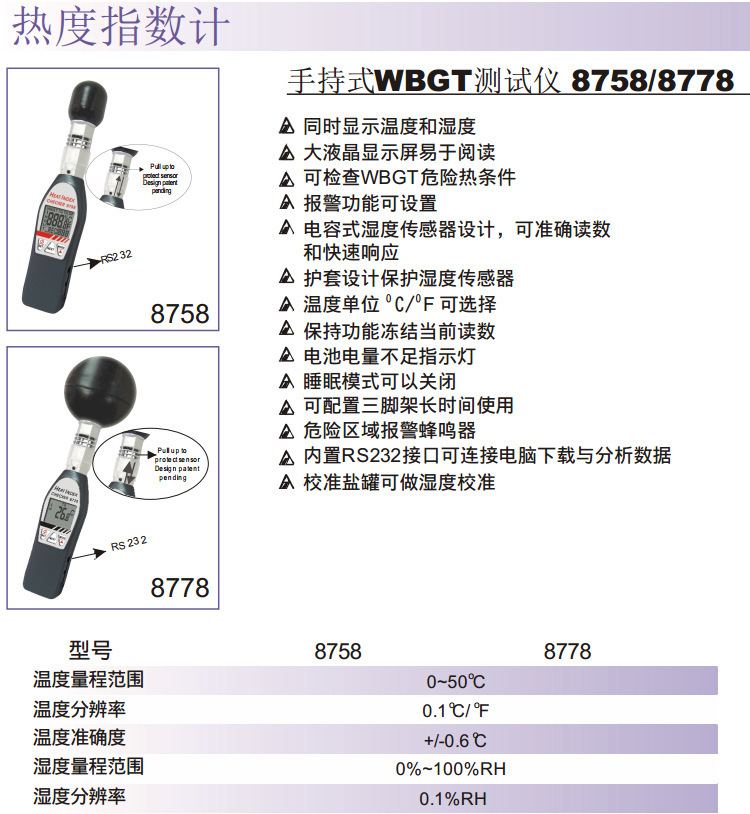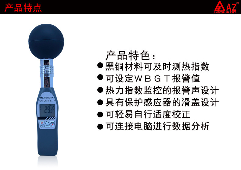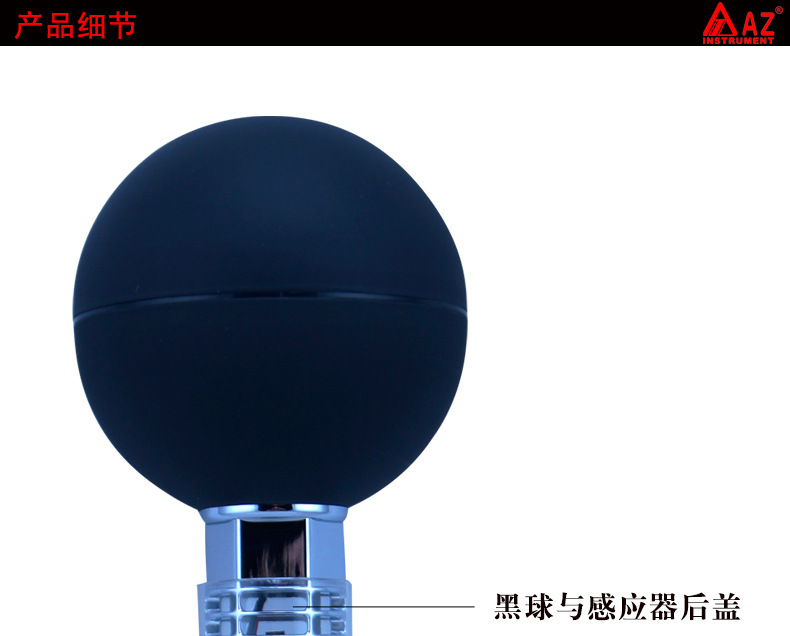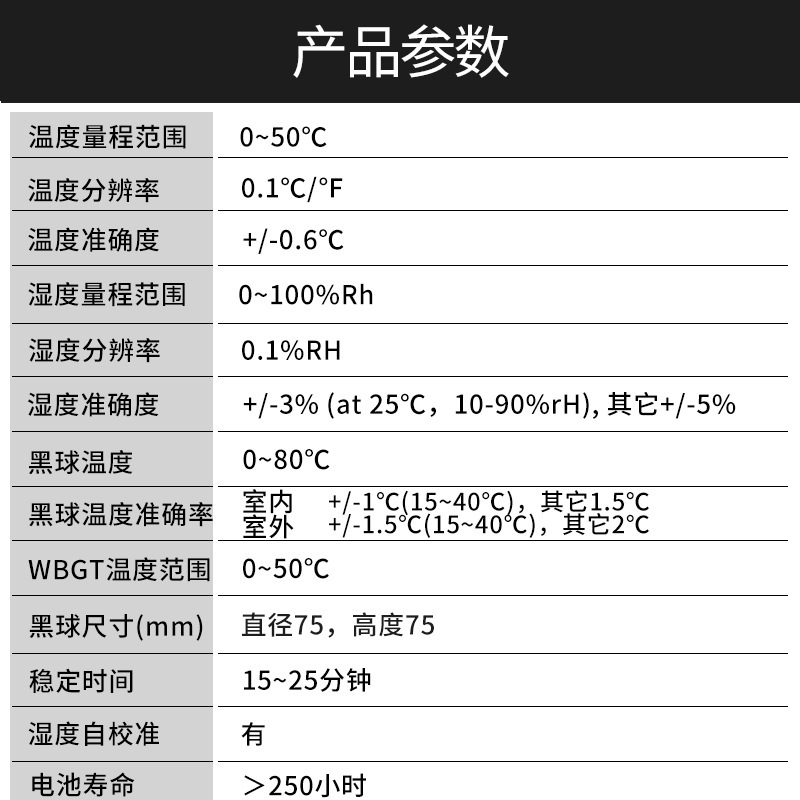 黑球大小:直径75mm 空气湿度:0% ~ 100%R.H. 准确度:±3% 空气温度:0~50℃(32~122℉) 准确度: ±0.8℃ 温度.(TG):0~ 80.0℃( 32~ 176℉) 准确度:±1℃(室内)±1.5℃(室外) WBGT温度:0.0~ 50℃( 32~ 122℉)