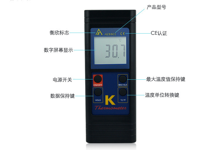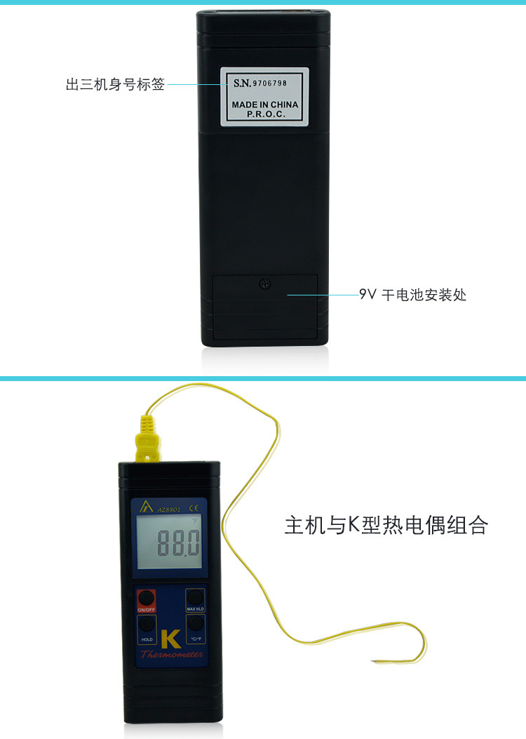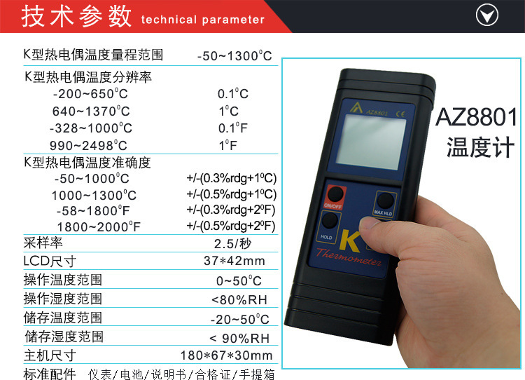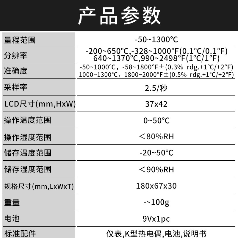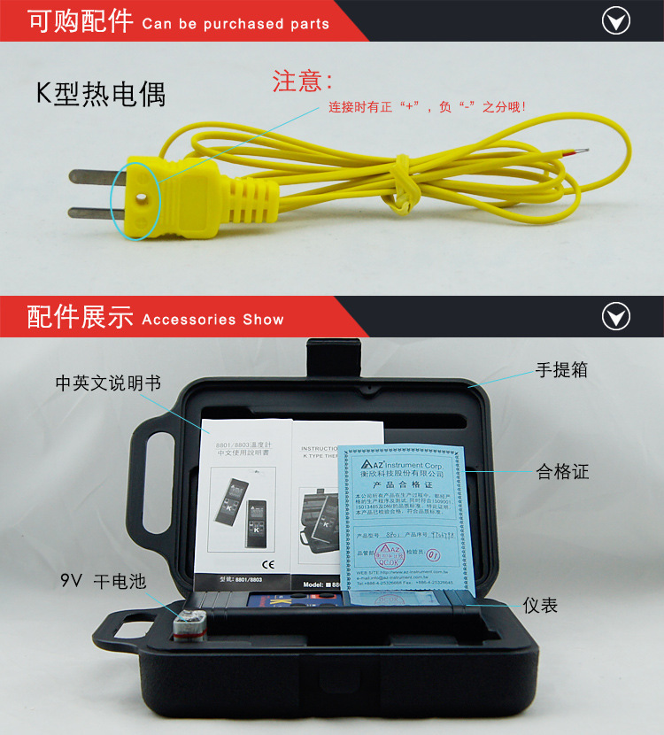 附件:携带盒,电池,K热电偶*1,使用说明书。