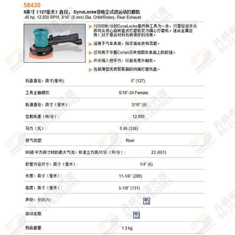 原装美国丹纳布雷DYNABRADE 58430 气动不吸尘双运动打磨机