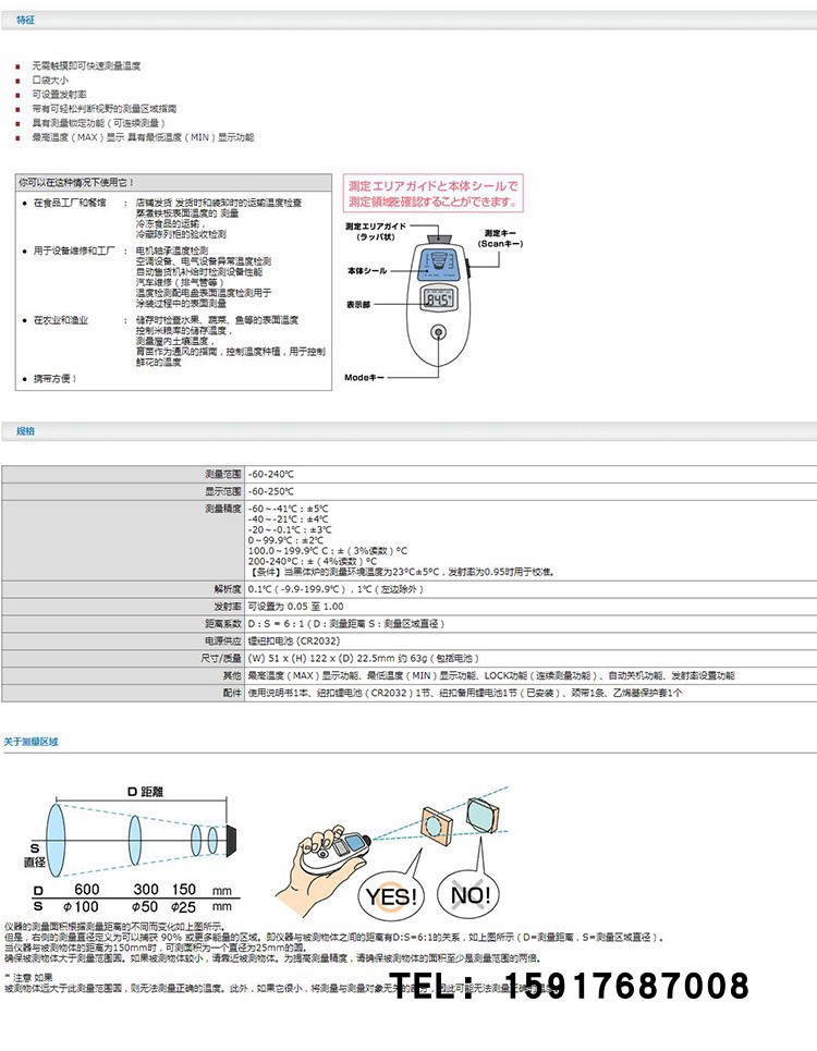 日本SATO佐藤袖珍型红外温度计 PC-8400 II 带喇叭型测量区域指南