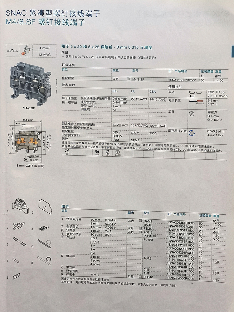ABB螺钉接线端子 M4/8.SF及端子适配附件PC81-10 FEM8S AD2.5等附件