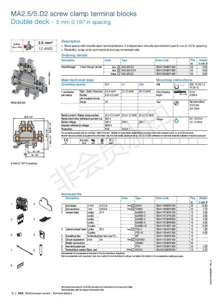 ABB MA2.5/5.D2.N螺钉接线端子适配附件BADH FEM6D短路等