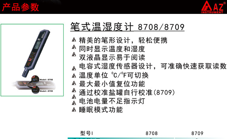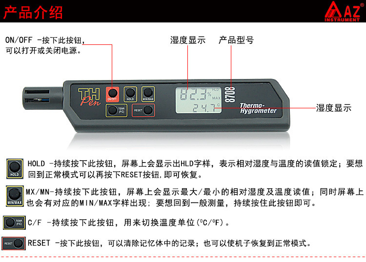 高级笔式温湿度仪表,带℃/℉切换功能!,快速响应,高准确度,自动关机自动关机功能。符合C.D.:89/336/EEC及标准:EN50081-1/1992,EN50082-1-1997