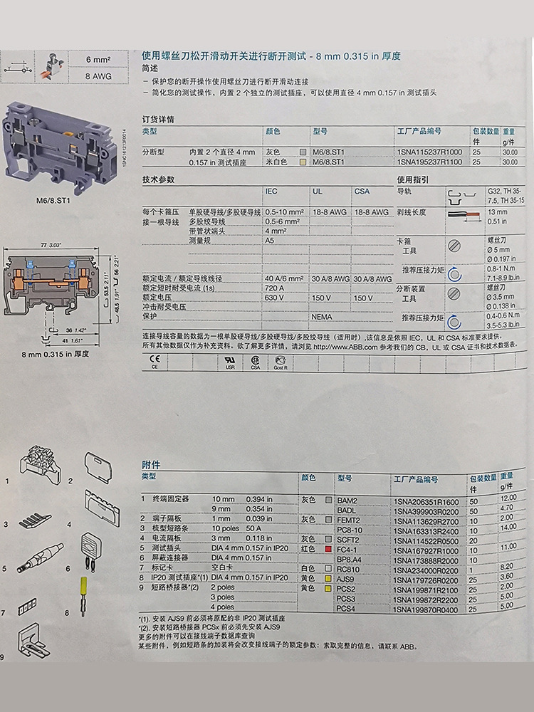 ABB 螺钉接线端子 M6-8.ST1适配附件端子隔板 短路桥接器等