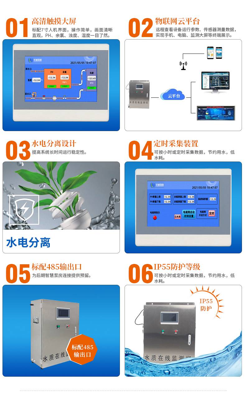 1、多参数水质在线监测仪可多种水质监测探头自由组合通过中控屏实时监测不同参数;