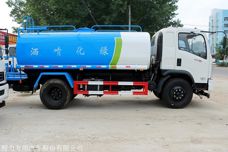 专用配置:罐体容积 9.2立方,罐体采用国标Q235碳钢材质,罐体厚度4MM,前后封头5MM加厚型,罐体内双层隔板具有防波荡作用,以减轻汽车行驶时罐内液体冲击;洒水车整车及外形尺寸严格按国家机动车公告制作而成;装配大功率专用洒水泵,整车前冲、后洒、侧喷、后平台带绿化洒水炮,洒水炮可全方位旋转,可连续调成直冲状、大雨、小雨、毛毛雨;配消防接口,自流阀,滤网,带自吸自排功能。前封头带水位计,后平台主管路带1寸浇花接口,后爬梯,带1个消防接头,带1个自流阀,1个过滤装置,其余标配。1、可选装后平台带雾炮机组用于喷雾降尘、农药喷洒作业;2、可选装前置电子洒水炮驾驶室操作;3、可选装气动球阀驾驶室操作。