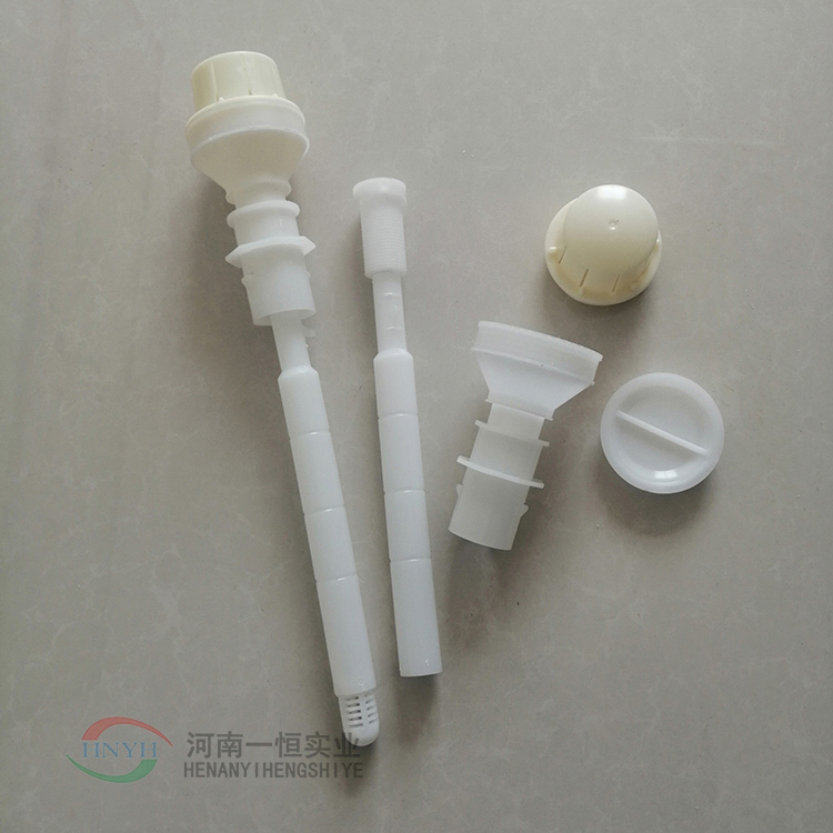 可调式气水反冲洗长柄滤头由预埋件、滤杆、固定圈、滤帽和防堵头组成,结构简单、施工管理方便,反冲洗水量仅为传统滤池的1/2~1/3,而且在反冲洗时空气 先进入配水区滤板底层并形成气垫层,当气垫层逐渐增厚至滤柄下部的进气孔和长条形进气缝时,大量空气就进入滤杆,并从滤头的缝隙冲出剪切冲刷滤料颗粒表面,致污质于滤层之上部,水气同时冲洗时滤料膨胀,进行适当擦洗。