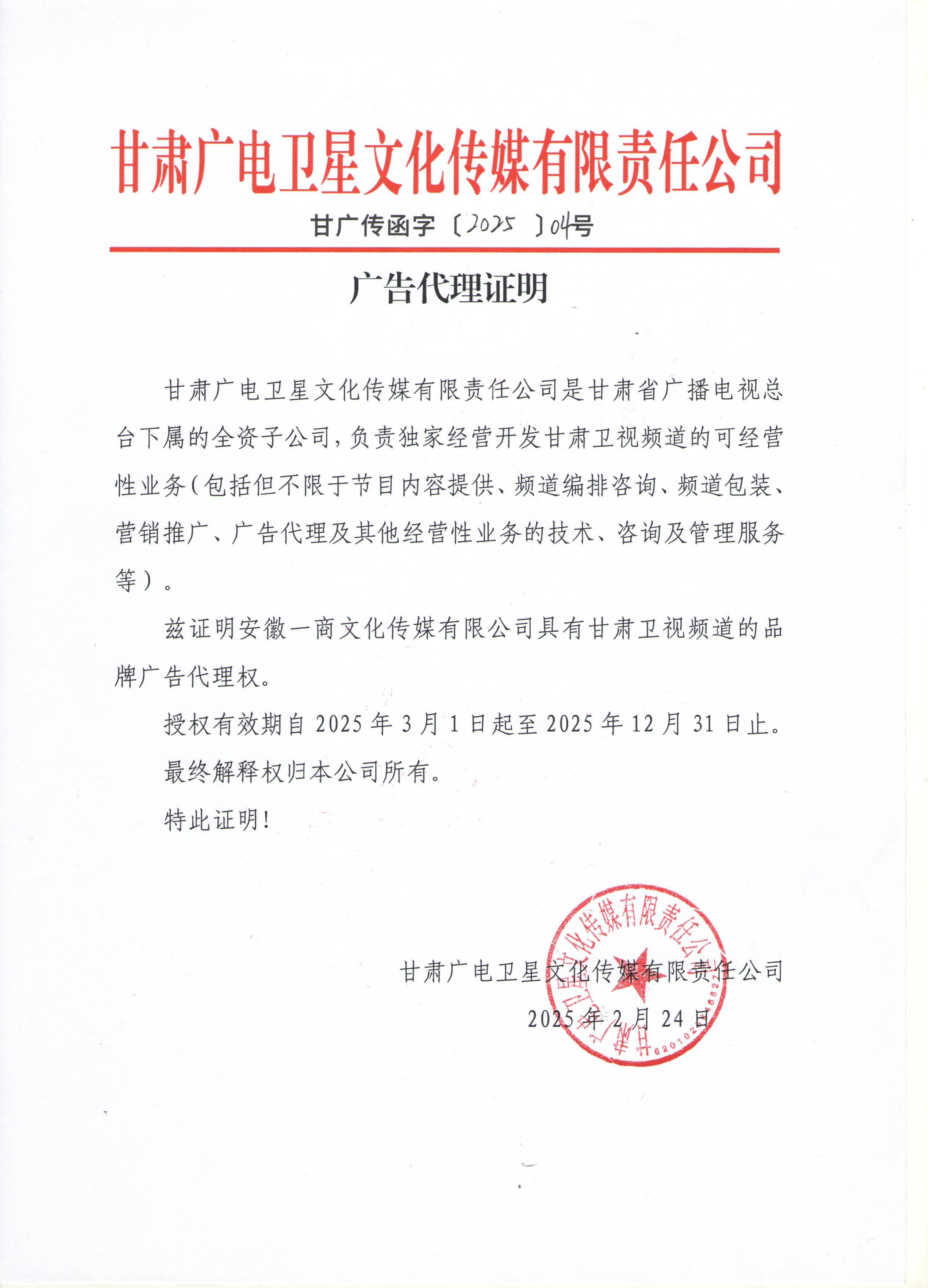 安徽一商文化有限公司为甘肃卫视2025年度甘肃广播电视台广告代理公司,代理甘肃卫视及甘肃广播电视台各频道的广告业务。一商传媒,此次获得2025年多家广告代理证,不仅是商业合作的成果,更是企业综合实力的多维象征,体现了一商传媒的行业地位、资源掌控力与市场话语权。