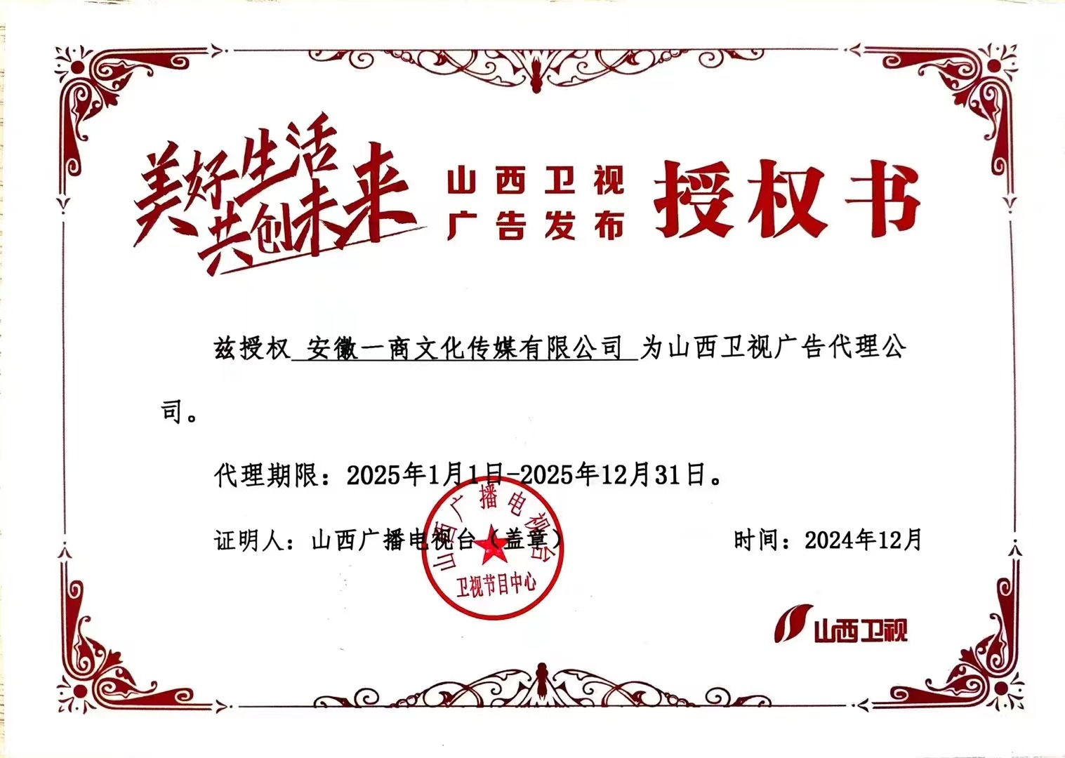安徽一商文化有限公司为山西卫视2025年度山西广播电视台广告代理公司,代理山西卫视及山西广播电视台各频道的广告业务。一商传媒,此次获得2025年多家广告代理证,不仅是商业合作的成果,更是企业综合实力的多维象征,体现了一商传媒的行业地位、资源掌控力与市场话语权。