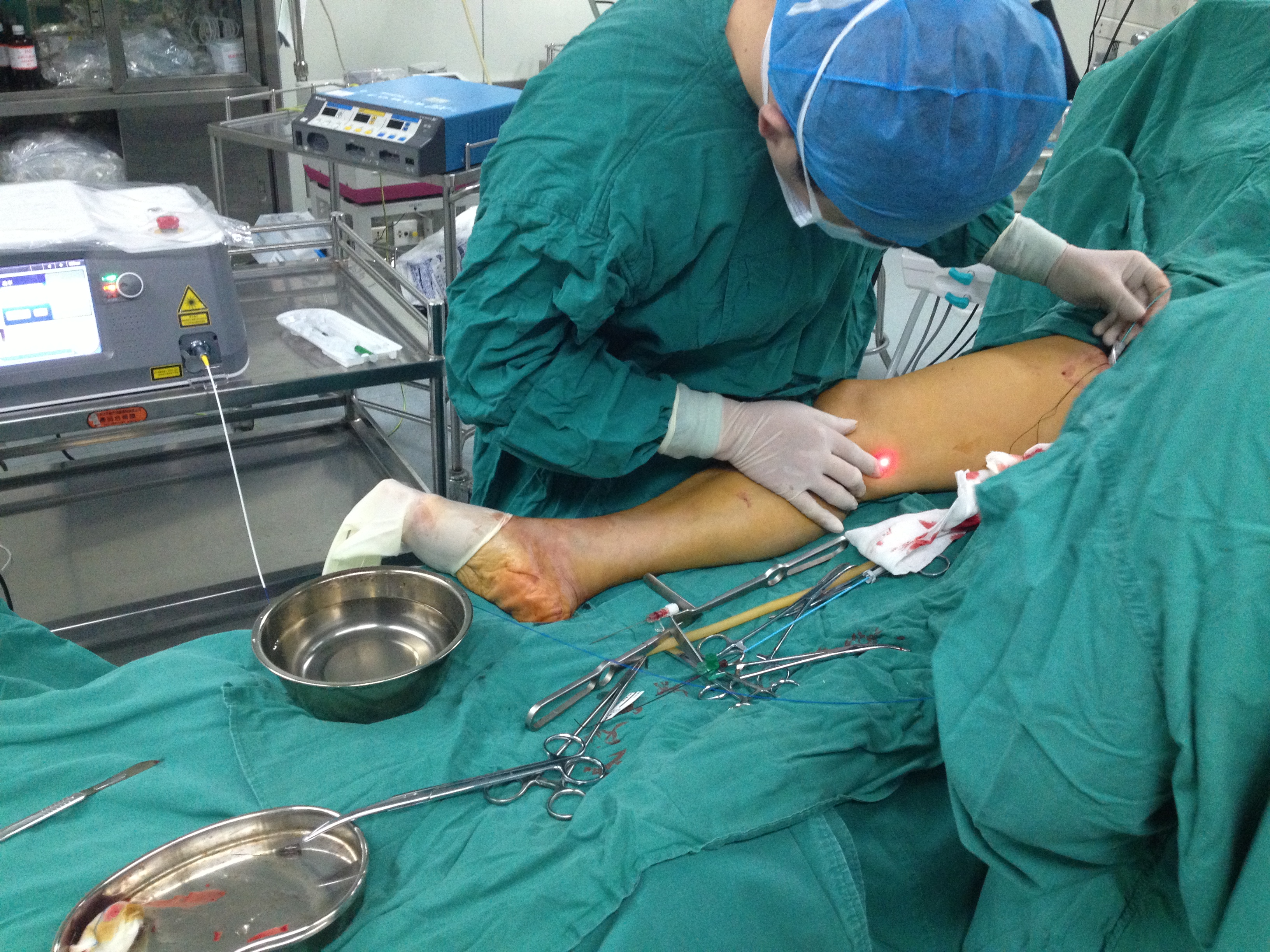 激光能量传导:光纤将特定波长的激光(如1470nm、980nm)导入病变静脉,热能导致静脉壁收缩、闭合,最终纤维化吸收。