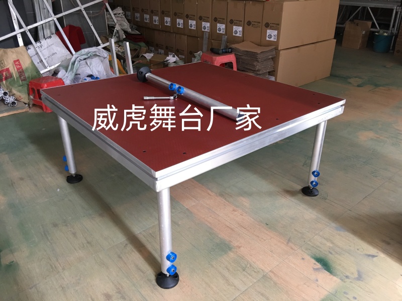 铝合金舞台:铝合金拼装舞台介绍:拼装铝合金舞台规格有1.22*1.22米或者1.22*2.44米。由支架,立柱,伸缩管,可调节底座,铝合金舞台板组合而成。每张舞台和相邻的舞台的立柱和支架是共用的,所以连接好后是一个整体非常牢固。拆装和安装方便,其铝合金舞台面是由胶片或钢化玻璃以及多层夹板与铝框构成,其具有较好的防火阻燃、耐磨损、无伤害、装饰性强等特点,铝合金舞台框采用高硬度铝合金材料,结构牢固,外观漂亮。