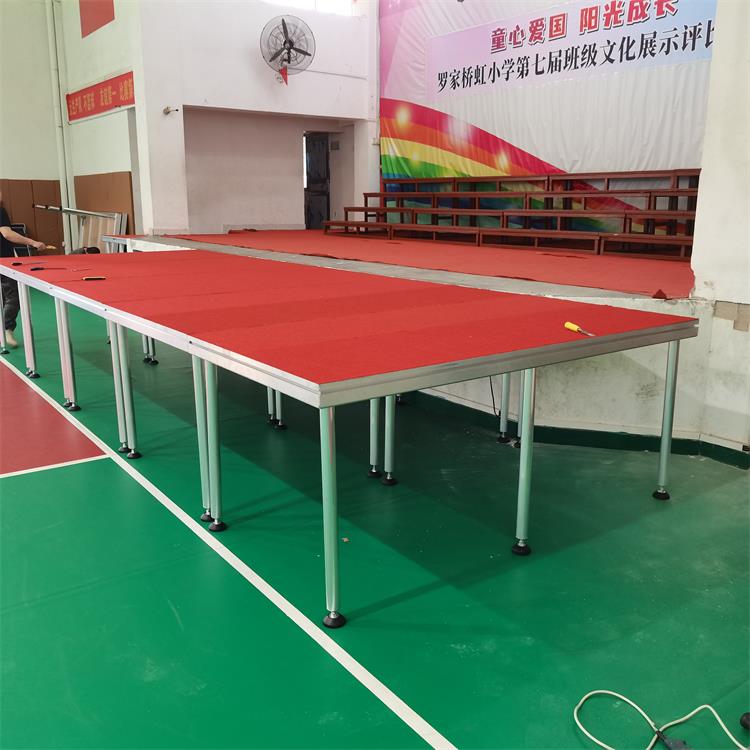 舞台板采用18mm厚的建筑胶合板和钢化玻璃板。舞台支架、立柱材质均为国标铝合金6061-T6,耐用、稳定、安全、拆装方便、易于搭建,储藏、运输以及安装大大节省了人力和财力,为我们提供了切实可用的方便。
