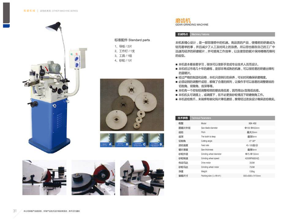 本机是一种专门研磨高速钢锯片、整体合金锯片的铣刀圆锯片的专用机械,可根据需要研磨出多种齿形,有鹰嘴形齿、三角形齿、斜齿等齿形。还可变换不同的切削角度,具有操作简单、磨齿速度快、生产效率高等特点。