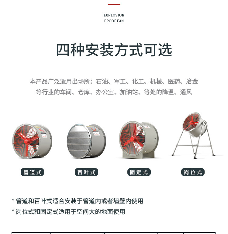 3、岗位式:除具有壁式特征外,附加岗位脚架附件,风扇腰中打安装孔Φ 12.
