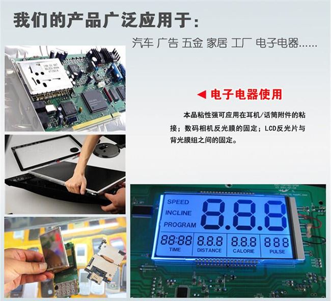 用途:广泛用于手机铭牌、耳机、话筒附件的粘接,数码相机反光膜的固定,LCD反光片与背光膜组之间的固定。