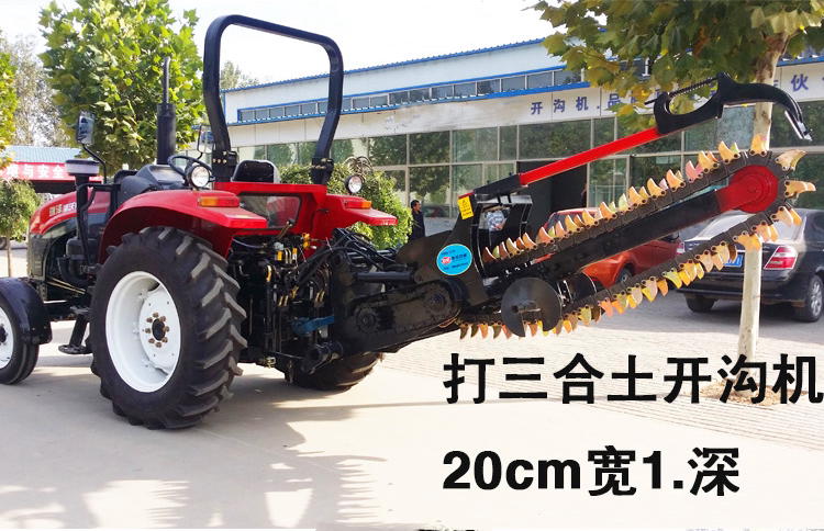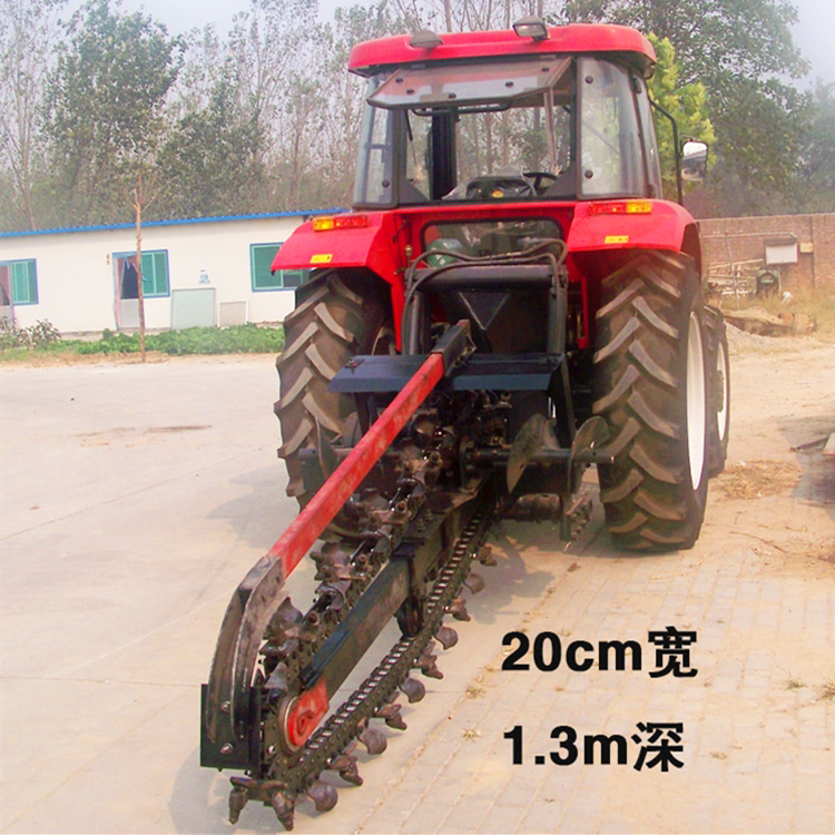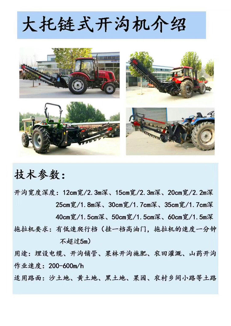 用途广泛,开沟宽度和深度可调节,适用于沙土,黄土,农田,红土地,黑土地,果园开沟,土地比较松软的地形,开沟机宽度用刀片可以根据用于需求进行调节,且沟直,壁陡,人工和挖掘机无法开出这样的沟,比挖掘机有更高的效率和经济效益(是挖掘机开沟速度的4-6倍),切削刀片和链条采用特殊材料与工艺制造,使用寿命长,特别是在挖窄沟的情况下(如,埋管和电缆),该机的作业效果就更加突出。整机结构简单,操作方便,维护容易,配套拖拉机必须有超低速爬行档(1分钟的拖拉机行走速度不能超过6米,柴油机转速达到1800转以上),若没有超低速爬行档我公司可对其进行改造,外置加装超低速装置,