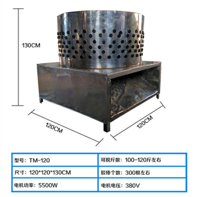 6、打上闸刀开关,机器启动、一边运转,一边在家禽身上加水,是热水,煺下的羽毛、污物随着水流一起出,水可循环利用,一分钟就煺尽羽毛,除净全身表皮污垢。