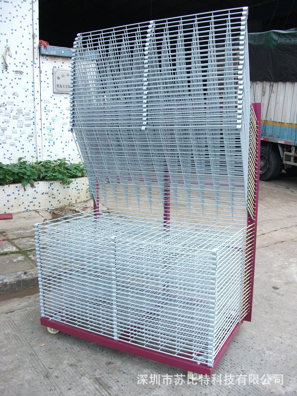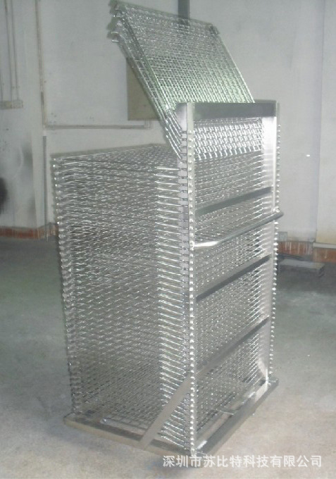千层架常规外尺寸:700*600*1210mm,网片尺寸:600*500mm,网格:10*10cm,支点:2个,层数:40层,高度:25mm/层,配置:螺丝弹簧,4寸黑色呢龙轮。表处理:不锈钢抛光。