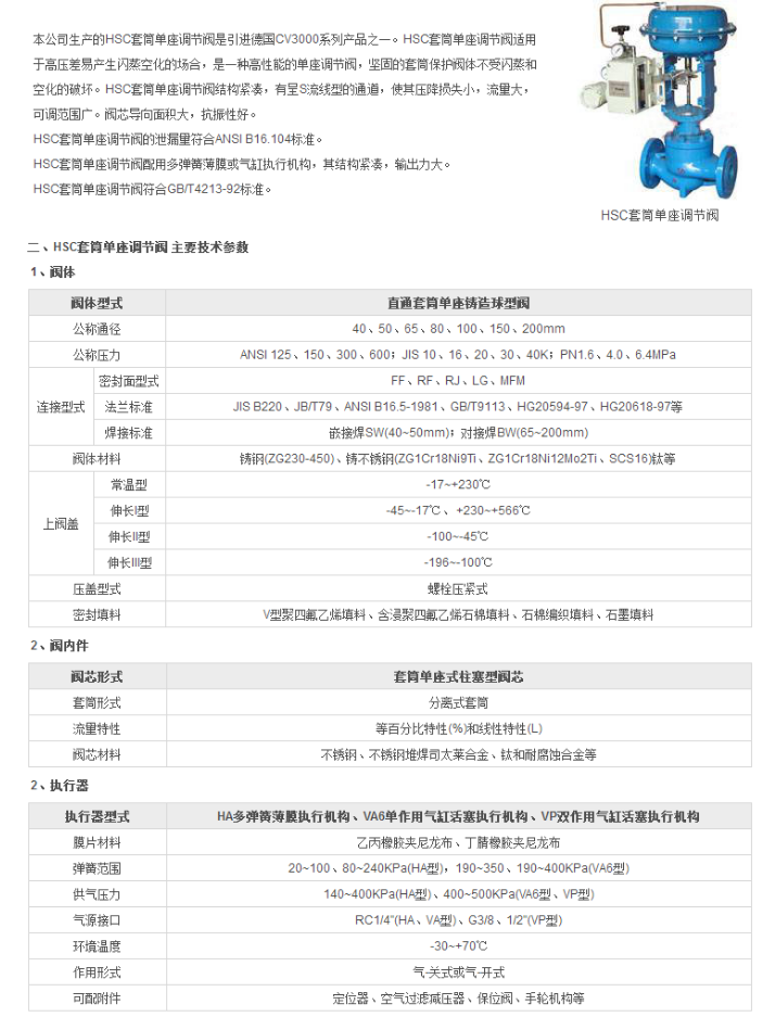本公司生产的HSC套筒单座调节阀是引进德国CV 3000系列产品之一。HSC套筒单座调节阀适用