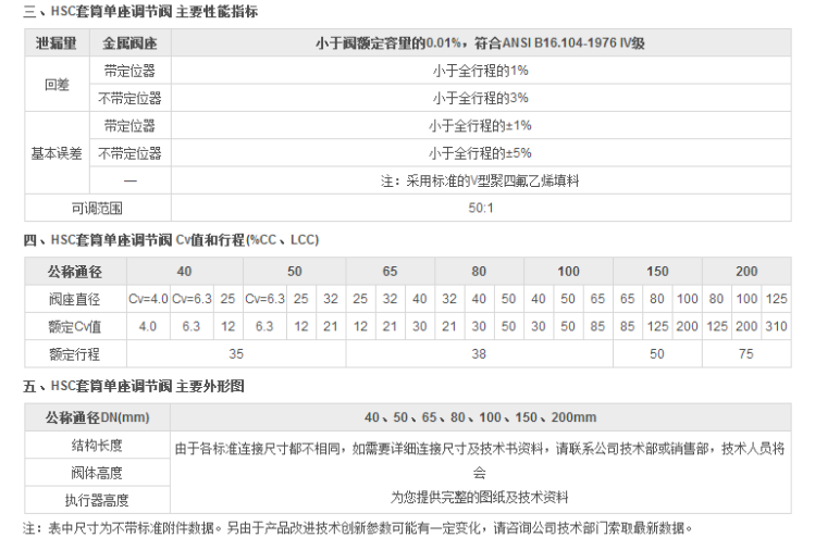 二、HSC套筒单座调节阀主要技术参数