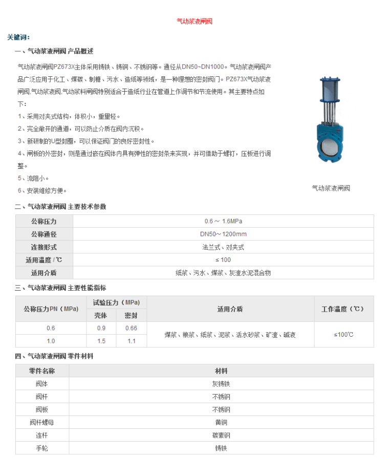 气动浆液闸PZ673X主体采用锈铁、锈铜、不锈钢等。通名从DN50-DN1000。气动浆液闸阀产