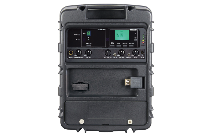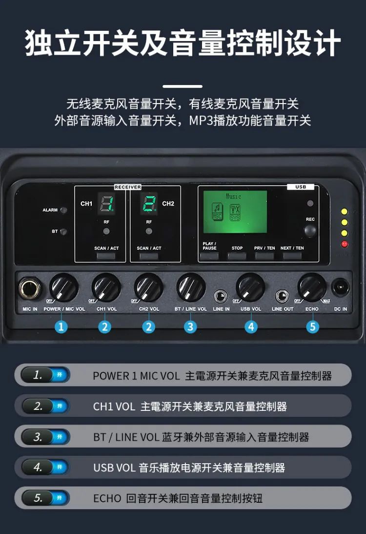 3. 共享音源输入控制模块,标配抽取式蓝牙模块、MP3播音座及UHF或ISM频段接收模块,接收稳定距离远,内建淡入功能的强劲警报音及ECHO功能。