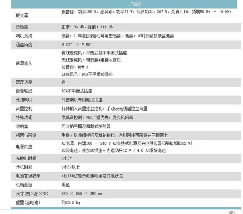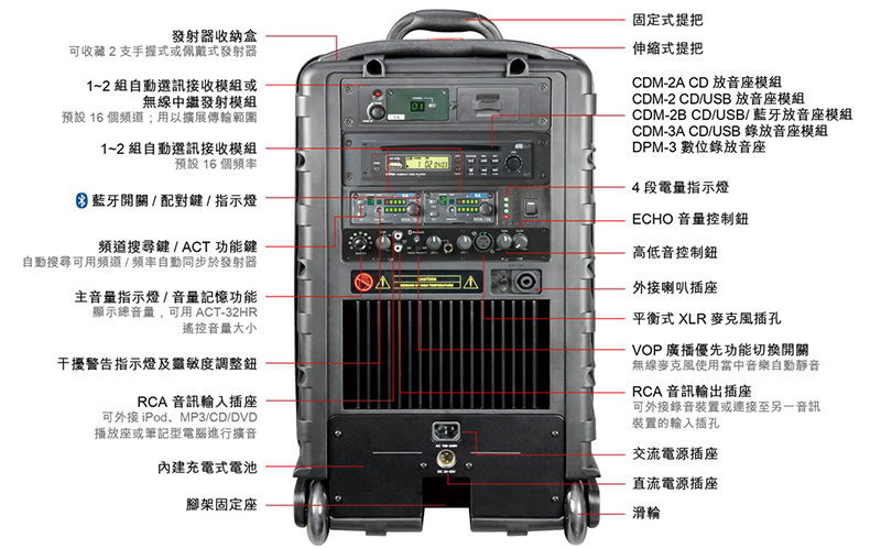 ? 机箱内建交直流两用的智能型电源供应器,可插接世界各种电压不必切换,可同时提供扩音机的电源及电池的快速充电,可一边充电一边使用,停电照常全功能动作。
