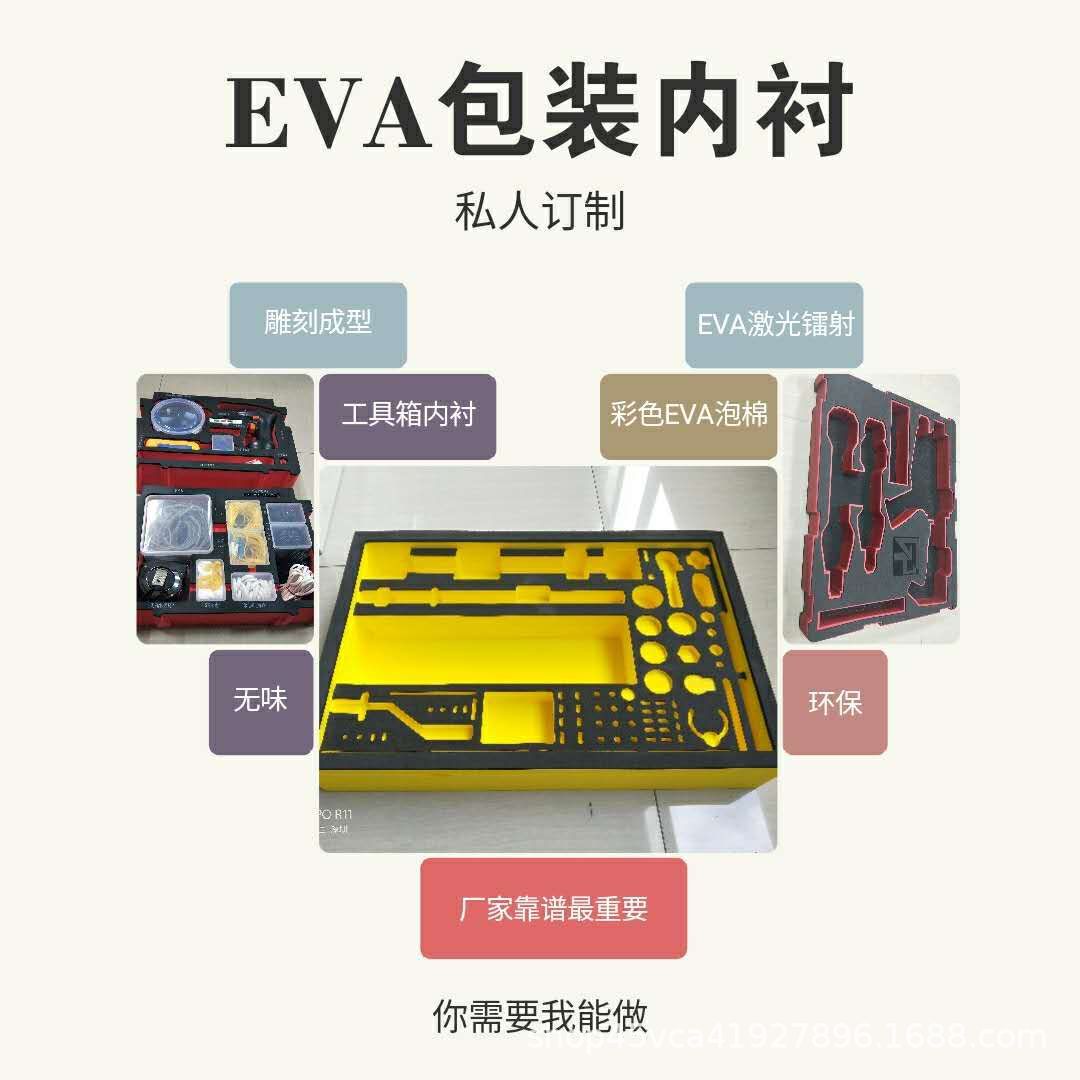 包装EVA产品范围:1、主要用于精密电子、仪器仪表、外销产品包装,具有良好的抗震缓冲效果;2、用于建筑,机电工程等广泛领域,例如:建筑防水、地毯夹层、隔音、精密零配件、各种管道保温等;3、良好的抗冲击性和缓冲效果的不变性等优点使得其广泛运用于家具、工艺礼品、木制品、玻璃陶瓷、箱包等,尤其在家用电器、专用设备以及办公设备包装方面应用更广。4、防静电包装。按照不同客户的各种要求,来图、来样设计加工! EVA内衬雕刻内衬EVA厂家