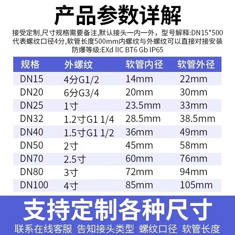 因为定制原因,产品规格尺寸、接头类型、螺纹口径以及软管长度等不同于其他常规产品,默认为接头一内一外,不附带其他任何元件等,接受定制各种尺寸 ,有需求会加收相应的费用。(以上价格只是常规的价格,如需具体价格请咨询客服)。