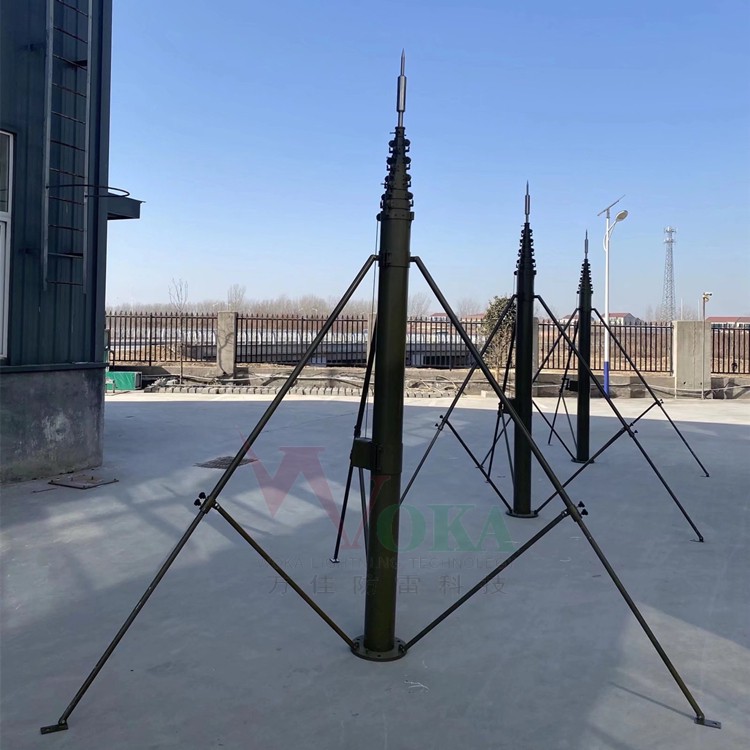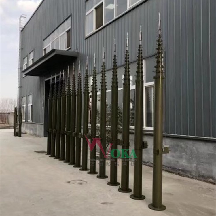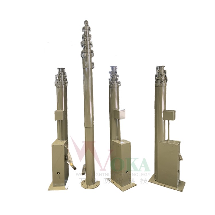 手动升降桅杆为架高设备载体,适用于车载天线升降杆,船载或陆地手动照明升降杆。它可以快速、可靠和AN全地将通信天线、照明、避雷、光传输和等设备上升到升降杆预定高度。工作完毕后,同样可以快速、可靠和AN全地将上述设备下降到升降杆预定高度。 郑州万佳防雷有限公司的生产手动升降杆,电动升降杆避雷针产品采用高度铝合金、碳纤维升降杆避雷针制造,耐腐蚀,重量轻,负载大、噪音小、升降快、抗震性小,平稳等优点。能够不同领域、不同场合对高度和载重的需求,此外,本公司天线照明手动升降杆还广泛应用于高尔夫、大型足球场夜间照明等。