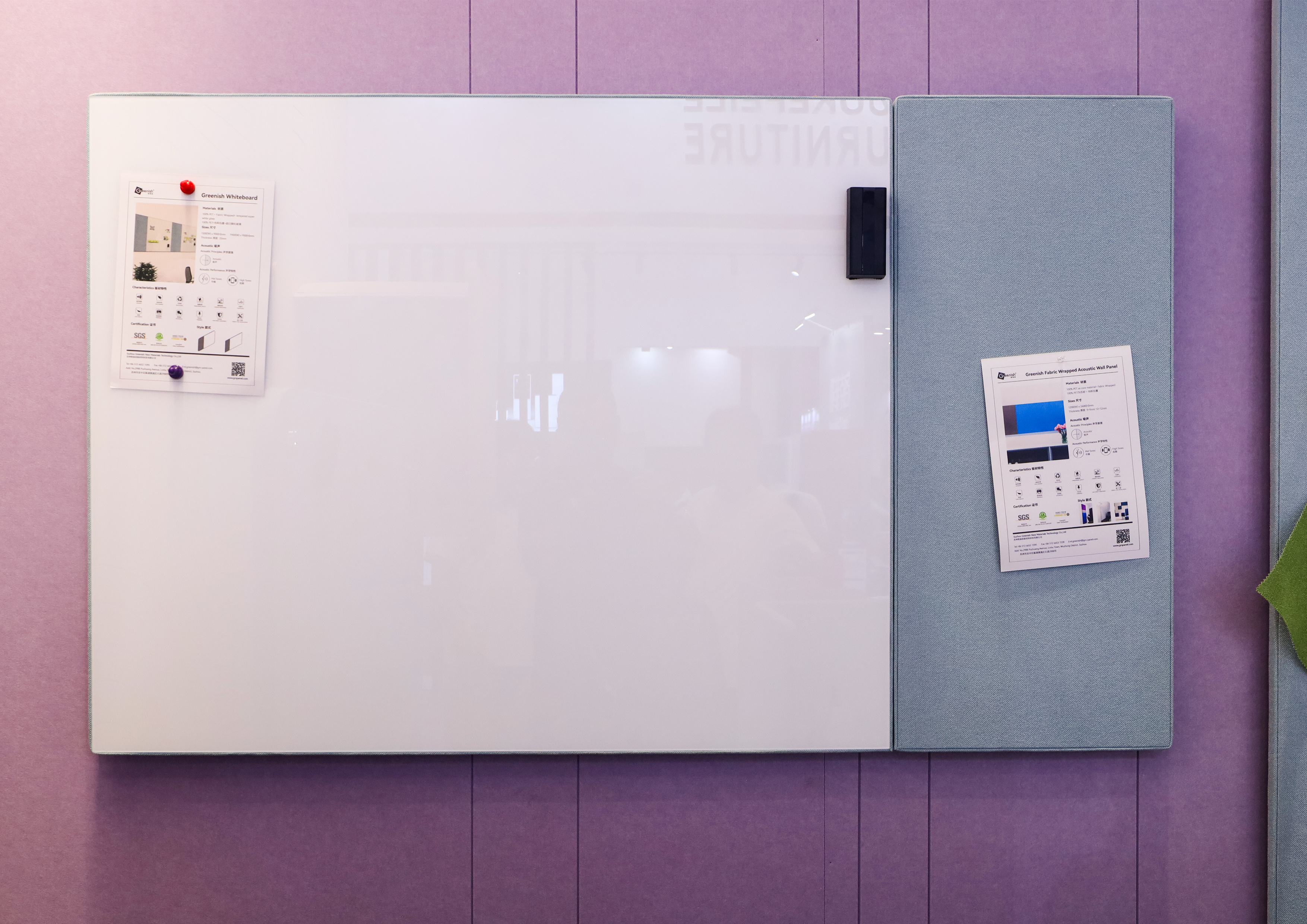 特点:良好的吸声功能,可移动白板采用钢架成型,PET 板作为芯材,