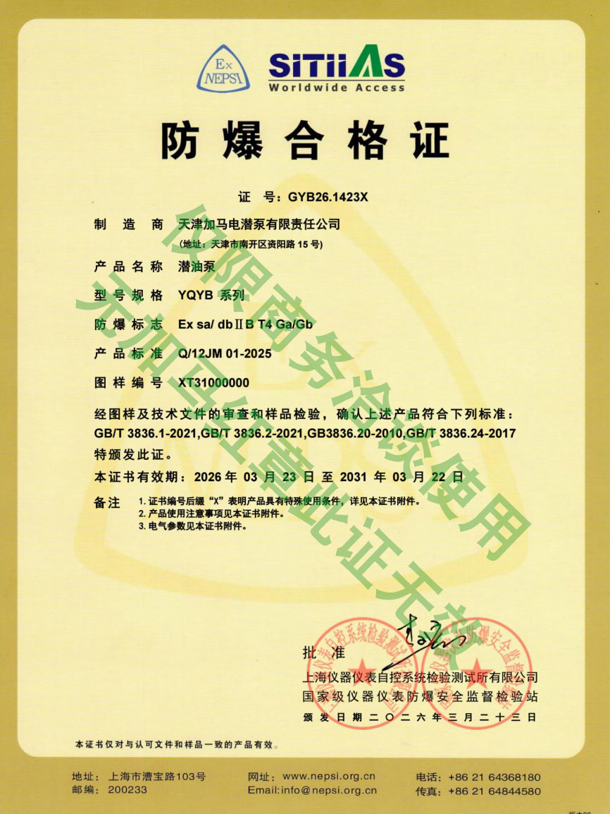 在防爆安全性方面,绿牌防爆潜泵采用了隔爆型外壳与浇封型相结合的防爆设计,防爆等级达到Exds Ⅱ BT4 Ga/Gb,不仅可在1区使用,更能满足0区(爆炸性气体环境持续存在)的严苛要求。运行时,流经定转子间隙的介质直接为电机降温并润滑轴承,温升极低,消除了表面热源隐患。配合内置的过流、过热及干转自动停机保护,即便在的情况下也能确保安全无虞。