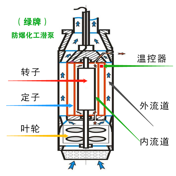 面对传统液下泵的结构性困局,绿牌防爆潜泵提供了一种全新的技术路径。其核心突破在于将电机从液面上“搬家”到了液面下,电机与泵轮同轴短接,整体潜没在介质中,整根轴的长度仅数百毫米,彻底告别了数米长的“大长腿”。