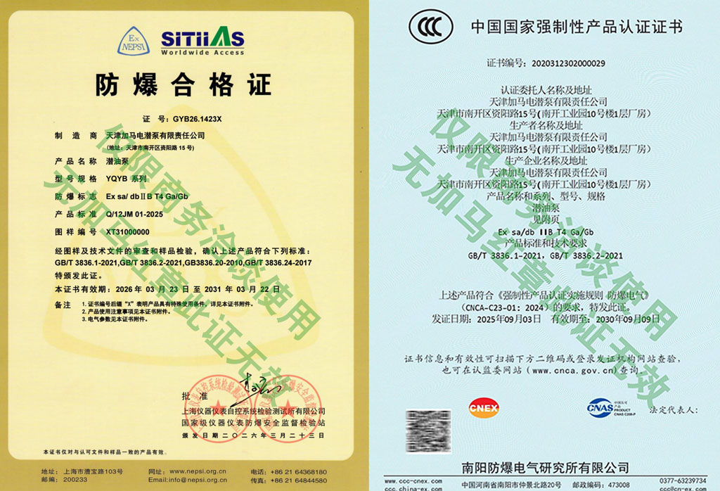 2025年12月,绿牌防爆潜液泵顺利通过船级社严苛检测,成功取得船级社认证证书,这标志着产品在船舶领域的适用性、安全性与可靠性获得权威背书。公司拥有多项专利技术,并通过了ISO9001体系认证,产品已在中石油、中石化、中航油等大型能源企业获得入围资格。