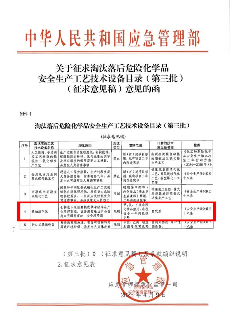 这种高温在输送易燃易爆介质时,无异于一颗“定时”。一旦轴承因磨损或润滑不良产生局部高温,极易引发火灾爆炸事故。正因为此,中石油曾专门发文停用长轴液下泵,应急管理部也在《淘汰落后危险化学品安全生产工艺技术设备目录(第三批)》中明确限制其使用,要求在役设备限期更换。同时,传统长轴液下泵以“负压抽吸”方式作业,在输送易挥发介质时极易产生气阻、气蚀现象,导致输送效率低下,甚至出现断流。