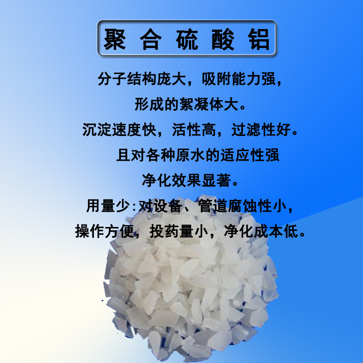 一.聚合硫酸铝是复合型高分子聚合物,分子结构庞大,吸附能力强,净水效果优于所有传统的无机净水剂。投入原水后形成的絮凝体大,沉淀速度快,活性高,过滤性好。 且对各种原水的适应性强,对水的PH值影响极小(PH值4-11)。不论原水浊度高低,废水污染物浓度大小,其净化效果显著。用量少:对设备、管道腐蚀性小,操作方便,投药量小,净化成本低。