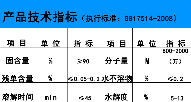 亲水性极好,能以任意比例溶解于水且不溶于有机溶剂。它具有絮凝性,增稠性,抗剪切性等多种性能,有效的PH值范围为7到14,在中性碱性介质中呈高聚合物电解质的特性,与盐类电解质敏感,与高价金属离子能交联成不溶性凝胶体。